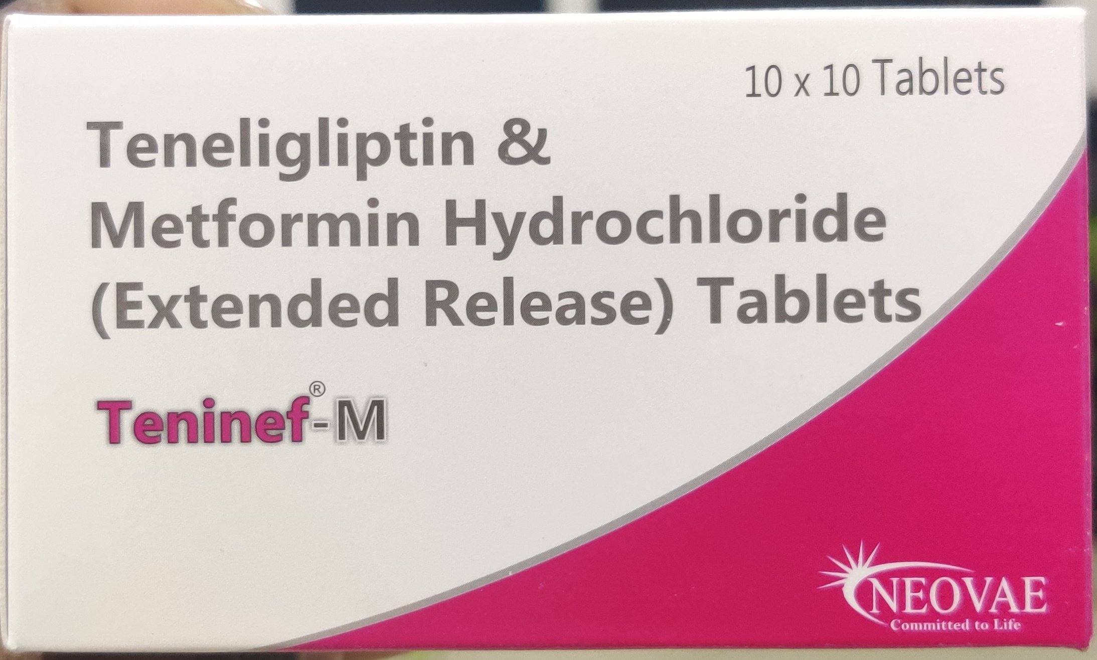 Teninef M (TENELIGLIPTIN 20 MG + METFORMIN 500 MG) is a combination of two drugs: Teneligliptin (Dipeptidyl peptidase-4 (DPP-4) inhibitor) and Metformin (Biguanide).TENELIGLIPTIN 20 MG + METFORMIN 500 MG is used to lower blood glucose levels in people with type-2 diabetes when treatment with a single drug is ineffective.
